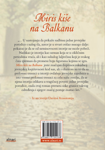 U nastojanju da prikaže sudbinu jedne jevrejske porodice s našeg tla, autor je u stvari otišao mnogo dalje: pokazao je da se od neminovnosti istorije ne može pobeći. Naslikao je istoriju kao neman koja se u cikličnim periodima vraća, ali i kao suludog šaljivčinu koji je svakog časa spreman da promeni boju figurama kojima se igra. Miris kiše na Balkanu jeste značajan doprinos oskudnoj jevrejskoj književnosti kod nas, ali s obzirom na to da su prelomni trenuci u istoriji ovdašnje jevrejske zajednice u isto vreme prelomni trenuci za celu našu zemlju, da se njena istorija oslikava u tragičnoj povesti jedne jevrejske porodice, onda ovaj roman prerasta uske granice takvog određenja i njegov značaj postaje znatno širi.